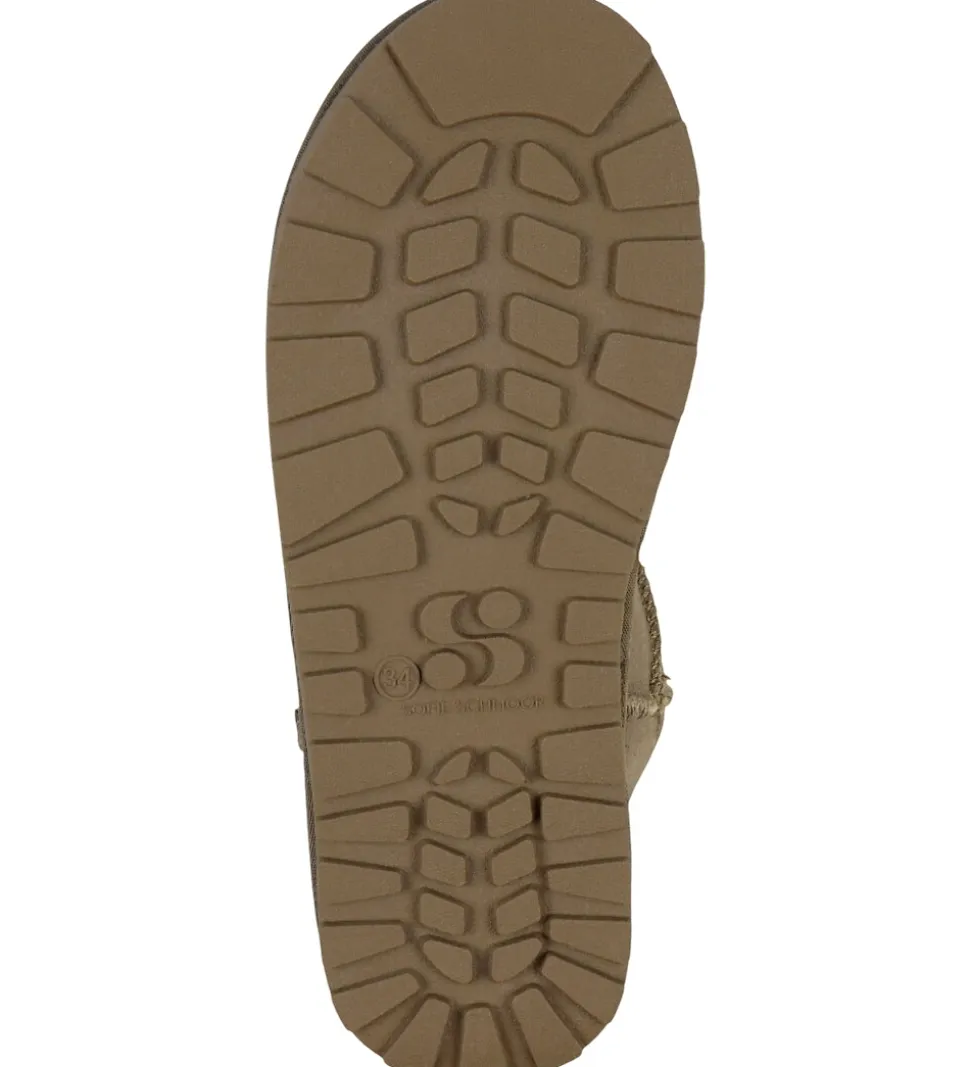 Smarte Sofie Schnoor bamsestøvler i gråbrunt ruskind med smarte syningsdetaljer. Bamsestøvlerne har et mellemhøjt skaft med en praktisk strop bagpå. Indvendigt er der lyst, imiteret pels. Ydersålerne er letvægtige og fleksible, og har et godt skridmønster under bunden, som sikrer et stabilt fodfæste.