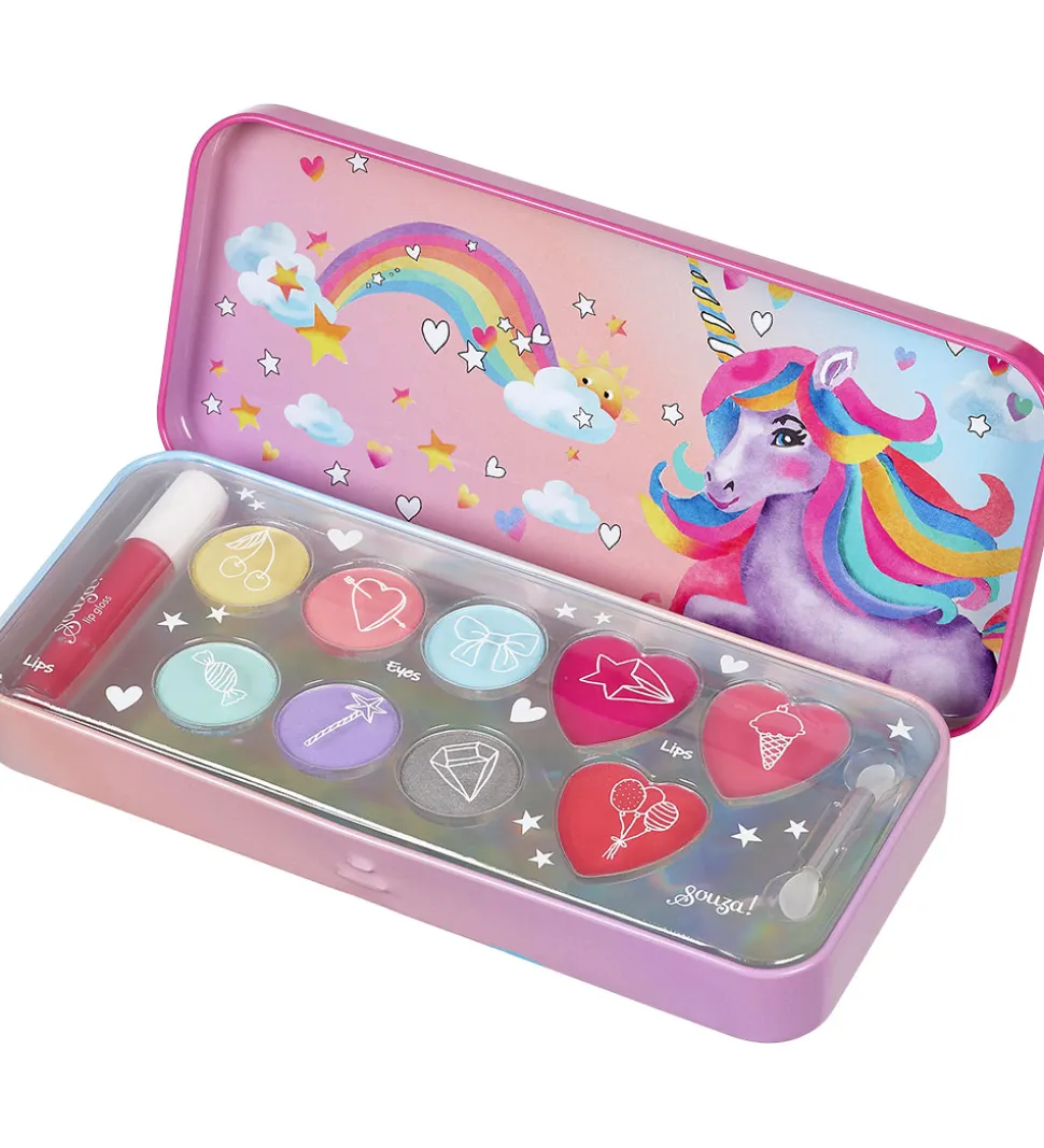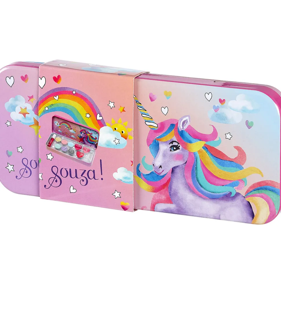 Fint Souza sminkesæt, som kommer i en metalæske med enhjørningeprint. Sminkesættet indeholder: