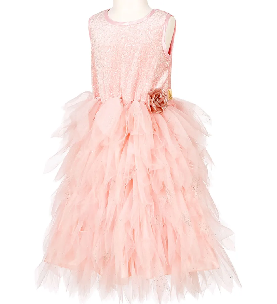 Souza udklædningen er i en flot, rosa farve med flerlags tylskørt og dekoreret med palietter, glimmer og en blomst ved hoften.