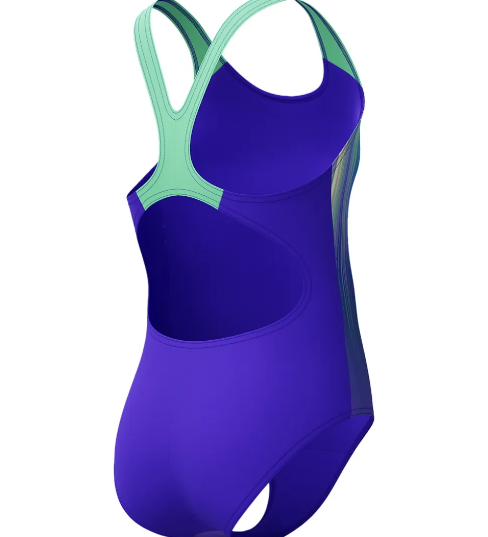 Lækker Speedo badedragt i lilla, og fortil har den et stribet mønster i lilla, blå og grønne nuancer.