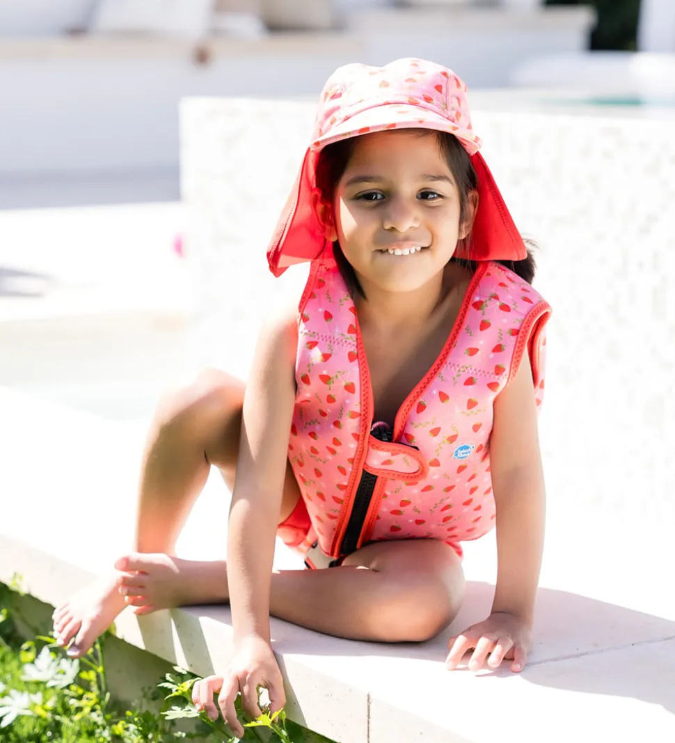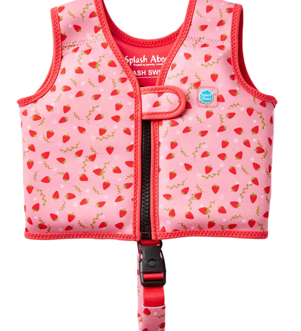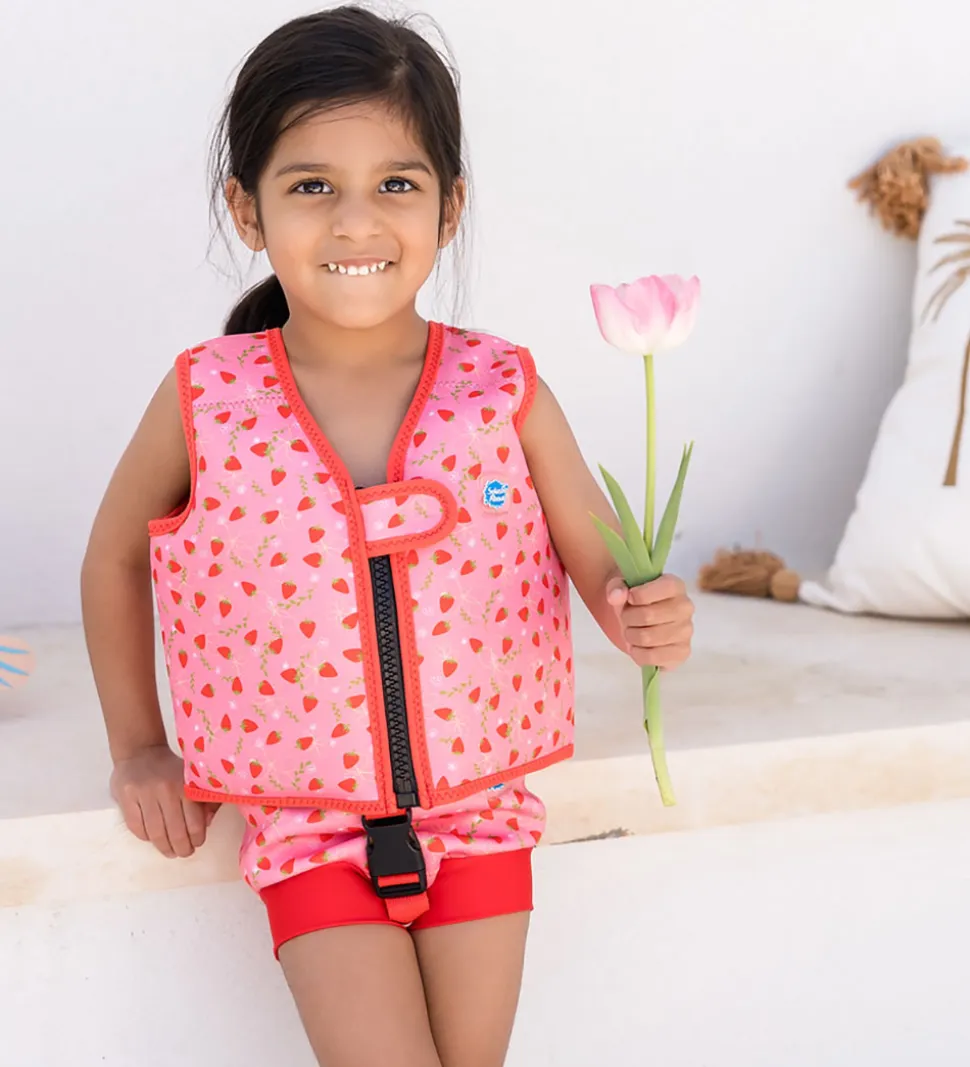 Skøn Splash About svømmevest i lyserød med røde kanter. Svømmevesten har et fint alloverprint af jordbær og blomster i rød, grøn, gul og hvid. På venstre bryst er der et logo i gummi. Splash About svømmevesten har brede skulderstropper og vesten åbnes fortil med en lynlås og en velcrostrop.
