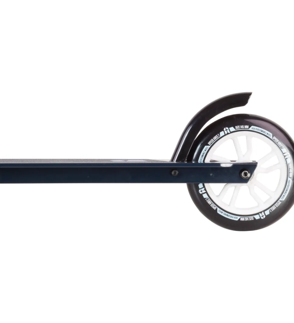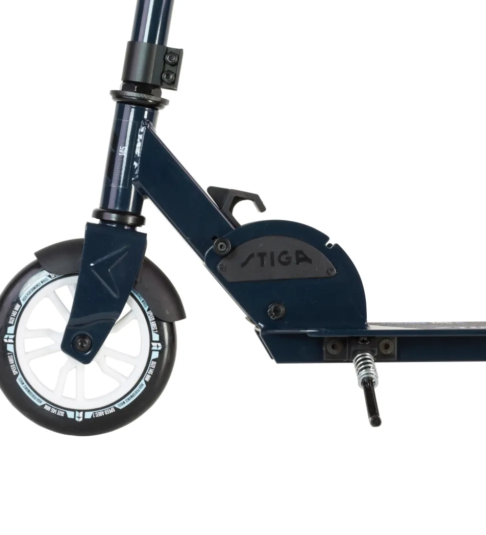 Stiga løbehjulets styr kan justeres i højden og har gode håndtag med TPE-greb. Løbehjulet har to 145 mm PU-hjul med ABEC 7 kuglelejer, og på baghjulet er der en god bremse.