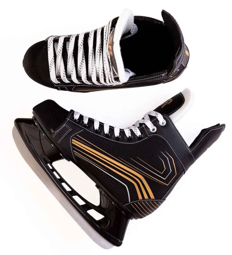 Flotte Supreme Ishockey skøjter i sort med guld og hvide detaljer og logoer.