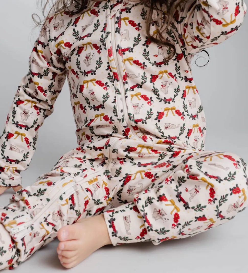 Charmerende heldragt fra Thats Mine i en blød, lys nuance med et sødt juletema. Mønstret består af katte, kranse og sløjfer, som skaber en hyggelig stemning.