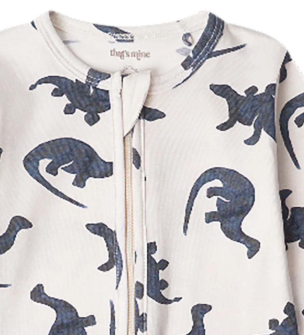 Charmerende Thats Mine heldragt i lysebeige med et flot dinosaurprint i blå nuancer. Thats Mine heldragten har lange ærmer og ben og er designet med en praktisk lynlås fra hals til fod, som gør det nemt at få dragten af og på.