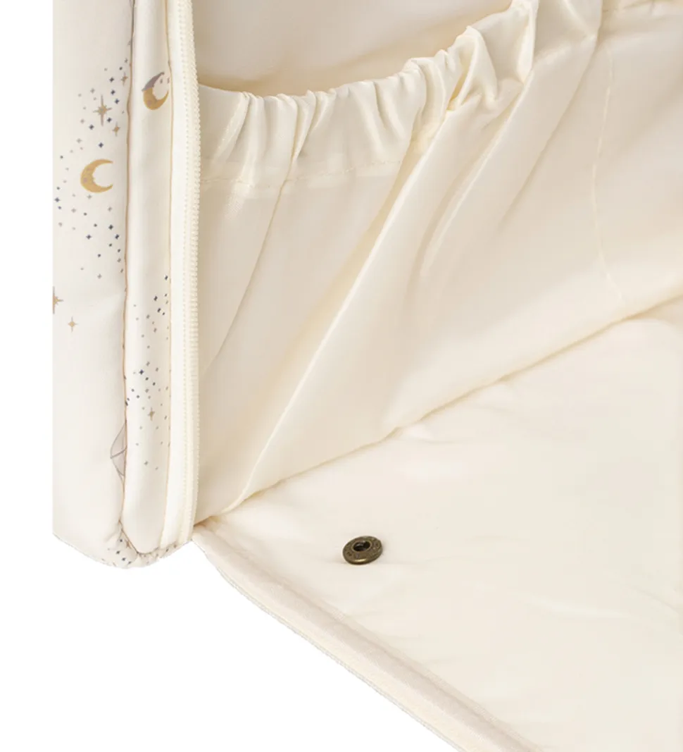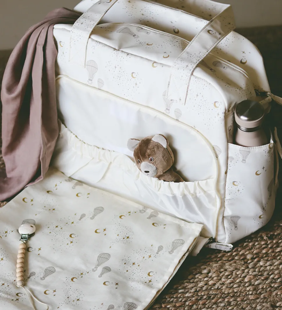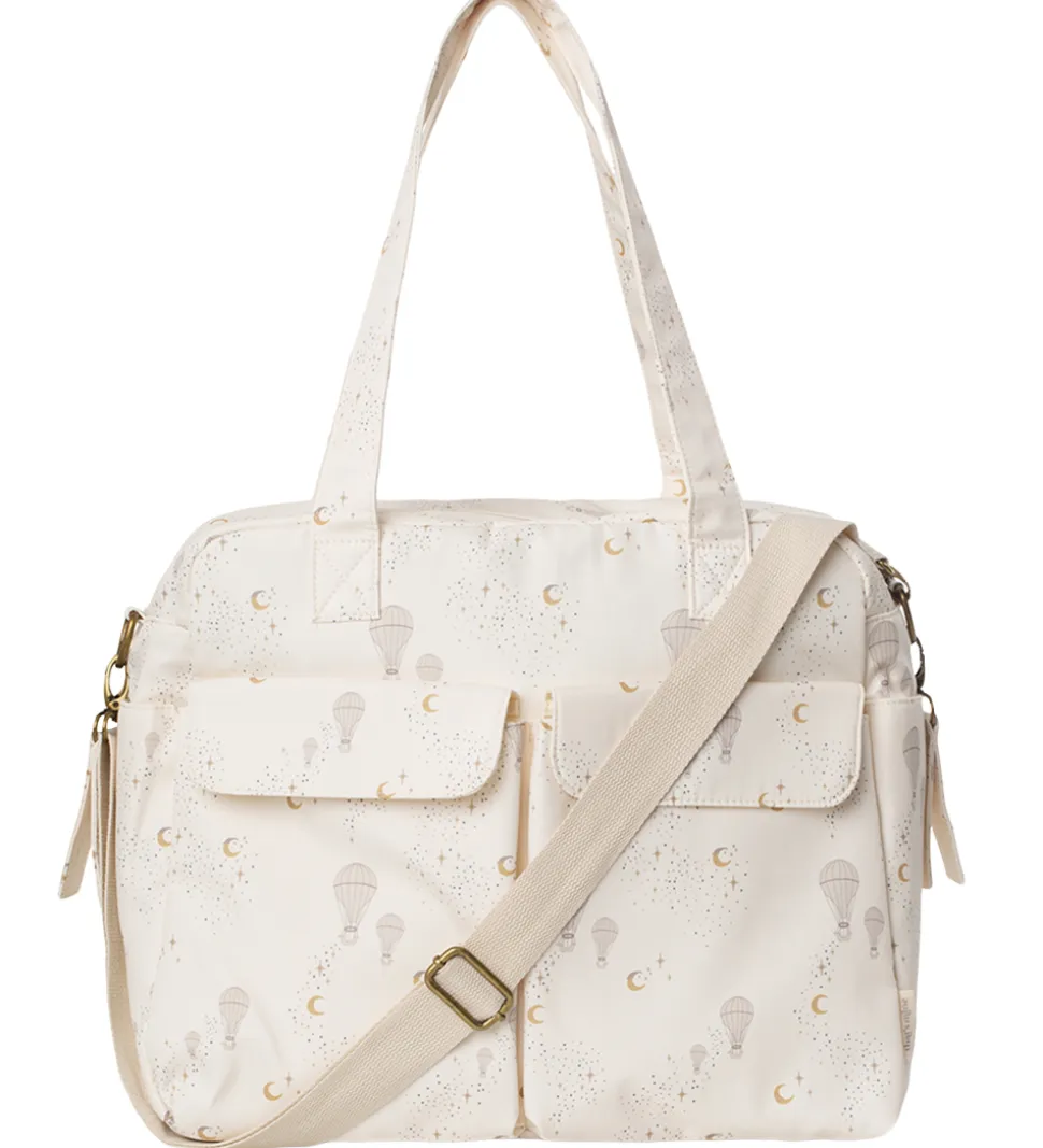 Fin That’s Mine pusletaske i cremehvid med et alloverprint af luftballoner, måner og stjerner i beige og gule farver.