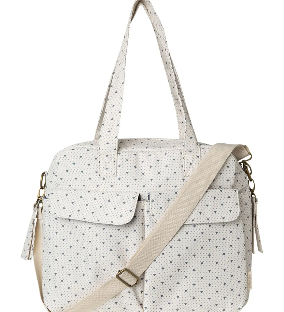 Fin That’s Mine pusletaske i en hvid nuance med et alloverprint af små hjerter og prikker i blå.