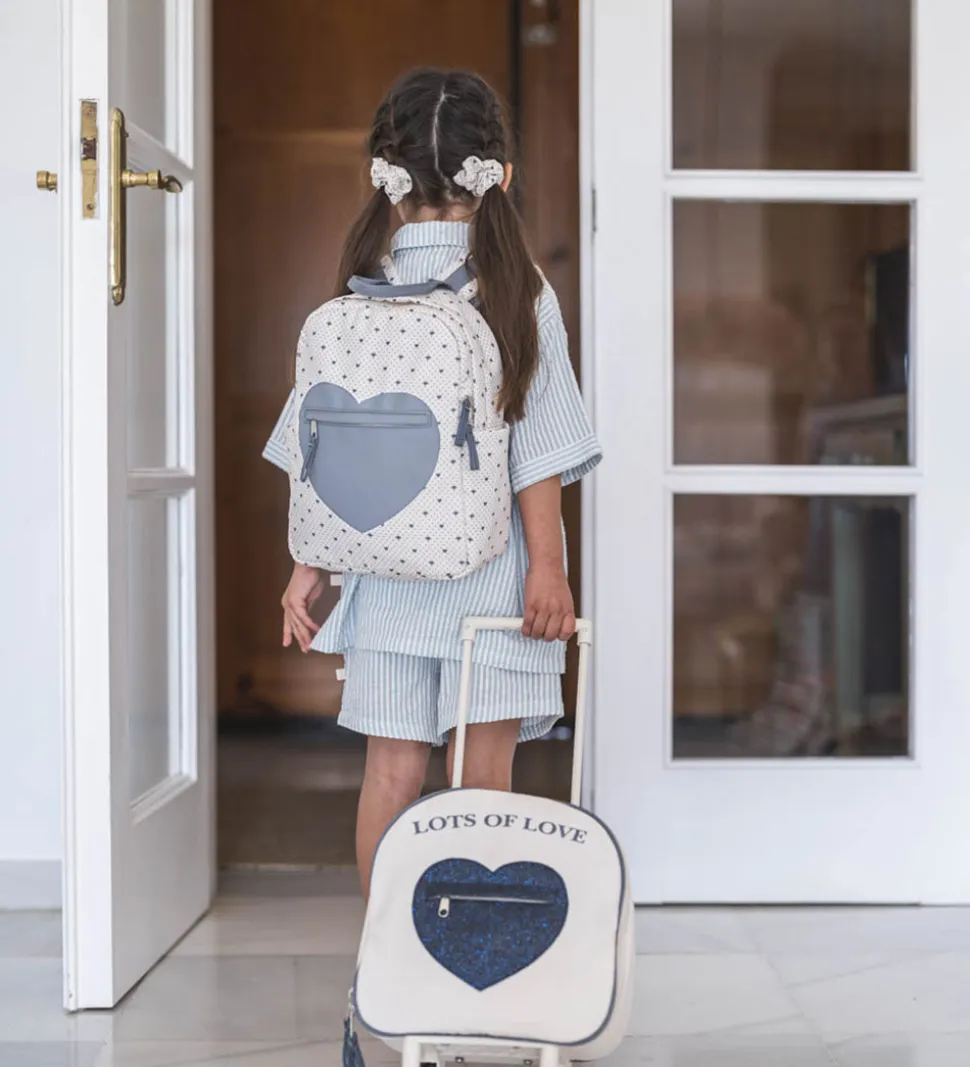 Praktisk That’s Mine rejsekuffert i en hvid naunce med blå detaljer og teksten “LOTS OF LOVE” og et glitrende hjerteprint på fronten.
