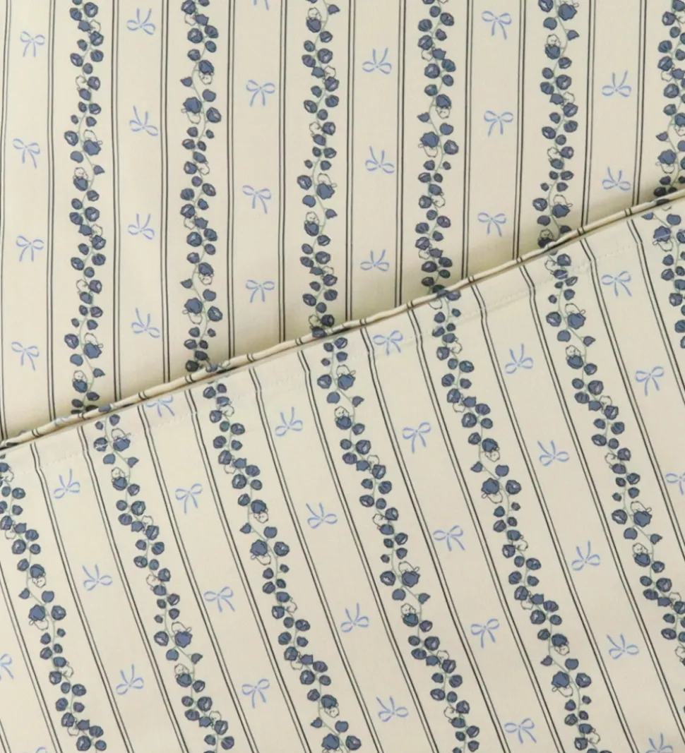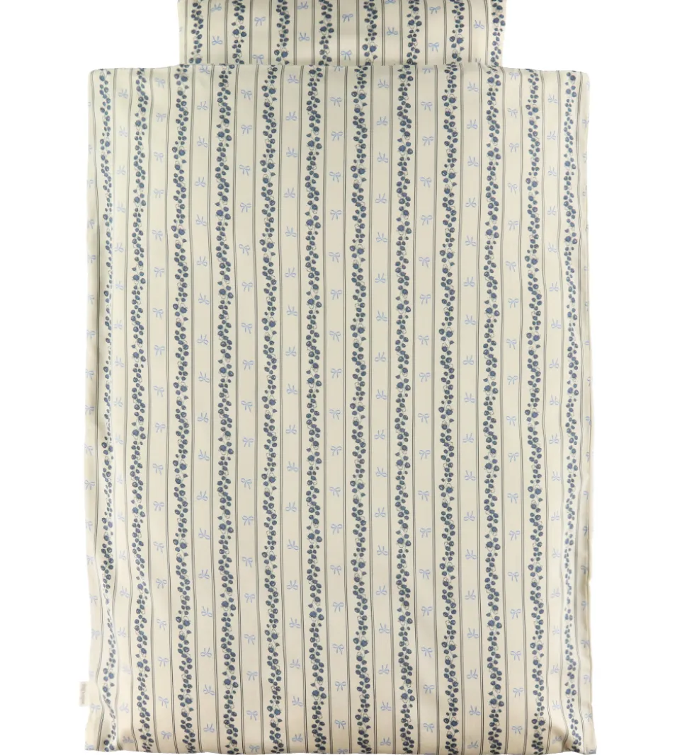 Sødt That’s Mine sengetøj i cremehvid med striber, små sløjfer og blomsterrækker i blå nuancer.