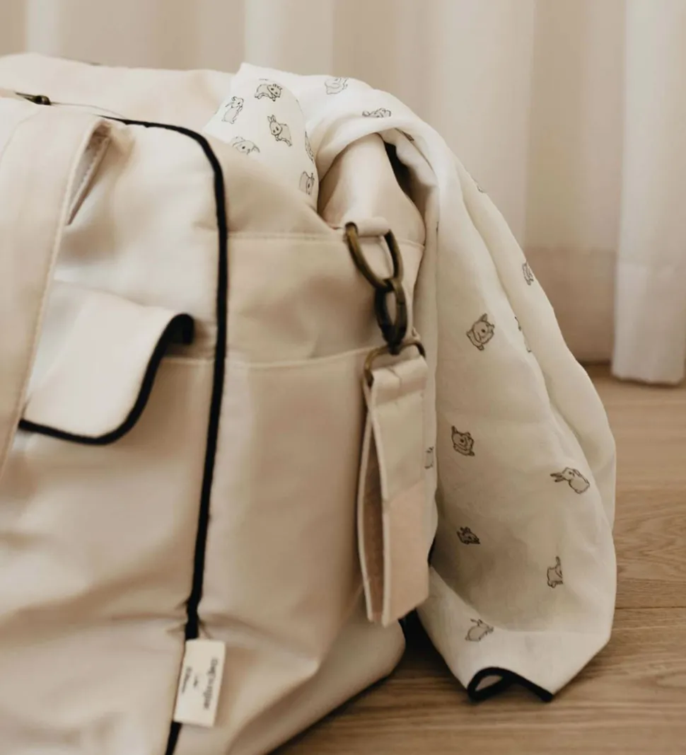 Praktiske Thats Mine stofbleer i en 3-pak. To stofbleer har en ensfarvet lys nuance, mens den tredje har et sødt motiv med små kaniner. Alle stofbleerne er kvadratiske med en fin musselin-struktur, hvilket giver et blødt og let udtryk. De har en mørk kant, der giver en diskret kontrast.