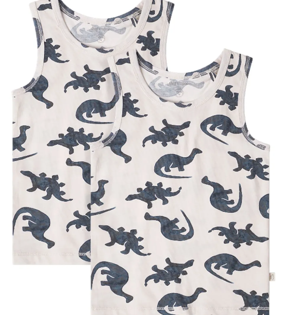 Skønne Thats Mine undertrøjer i en 2-pak. Undertrøjerne er lysebeige med et dynamisk dinosaurprint i mørkeblå nuancer. De har brede stropper og en rund halsudskæring, der giver et klassisk udtryk.