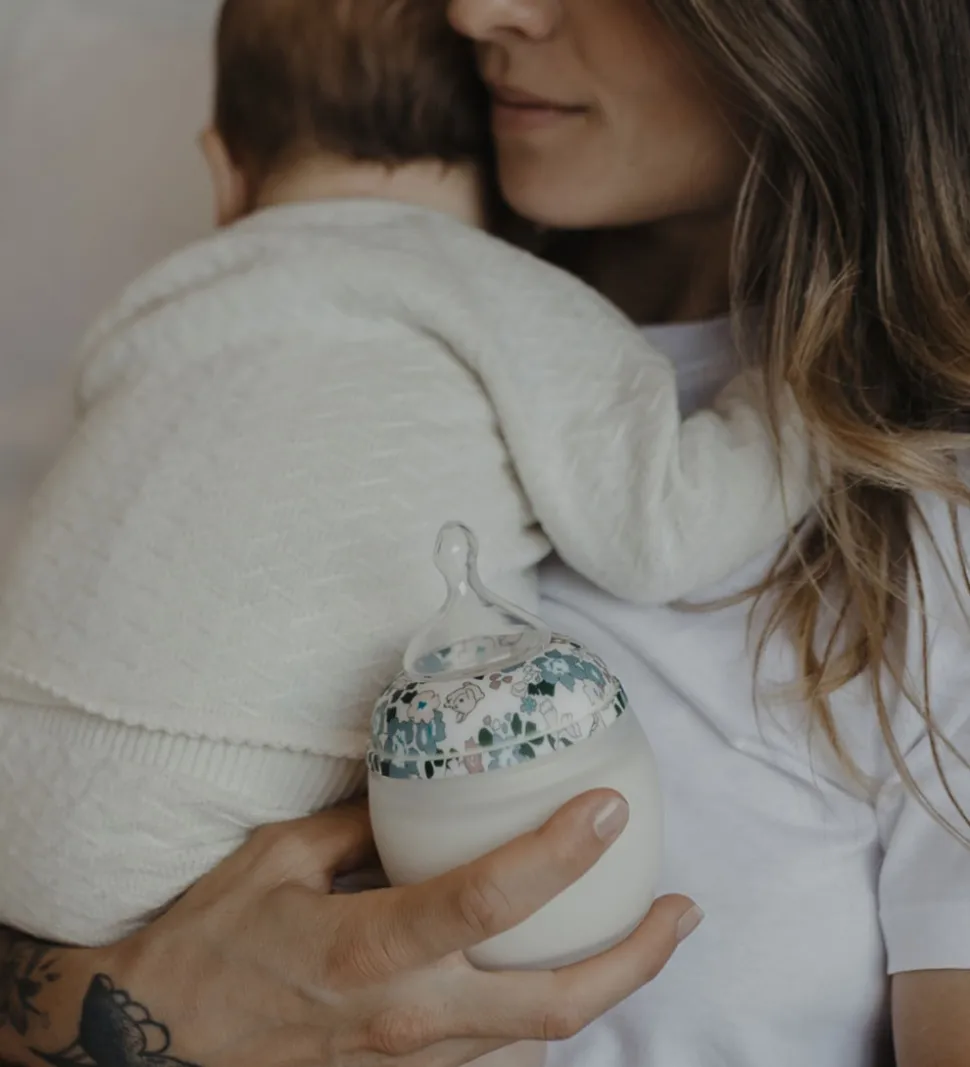 Lækker Thats Mine sutteflaske med låg i samarbejde med Élhée i hvid med et smukt blomsterprint.