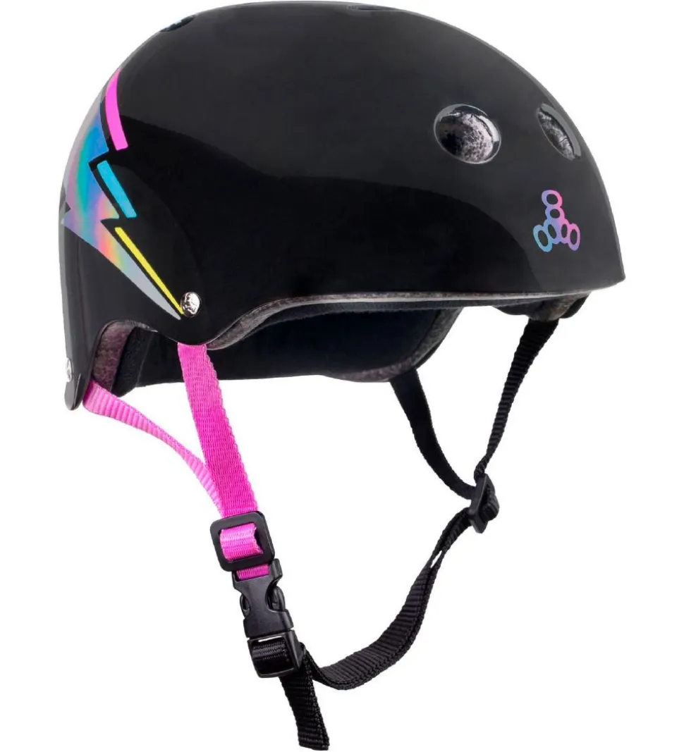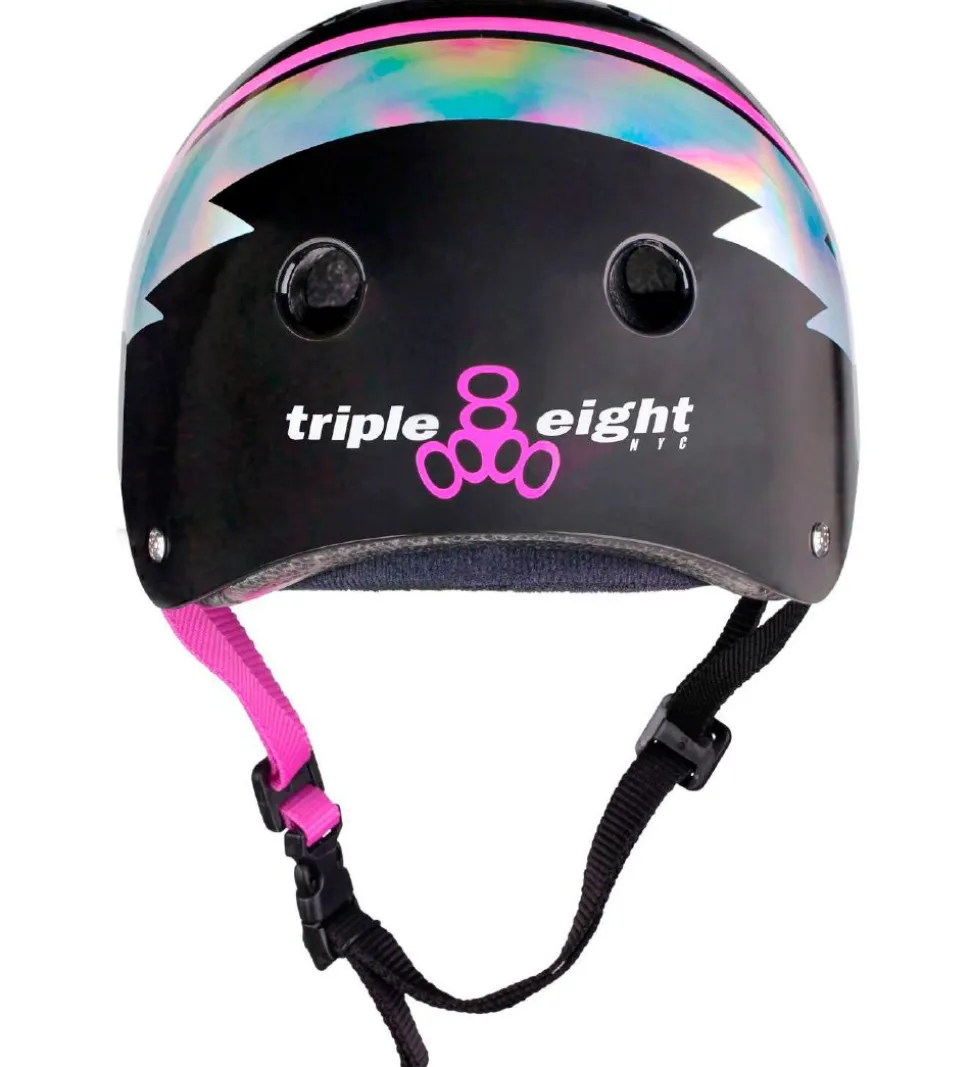 Fin Triple Eight hjelm i sort med et logo fortil samt et lyn på begge sider i sølv med et holografisk look. Bagtil er teksten “triple eight NYC” i hvid og endnu et logo i rosa.