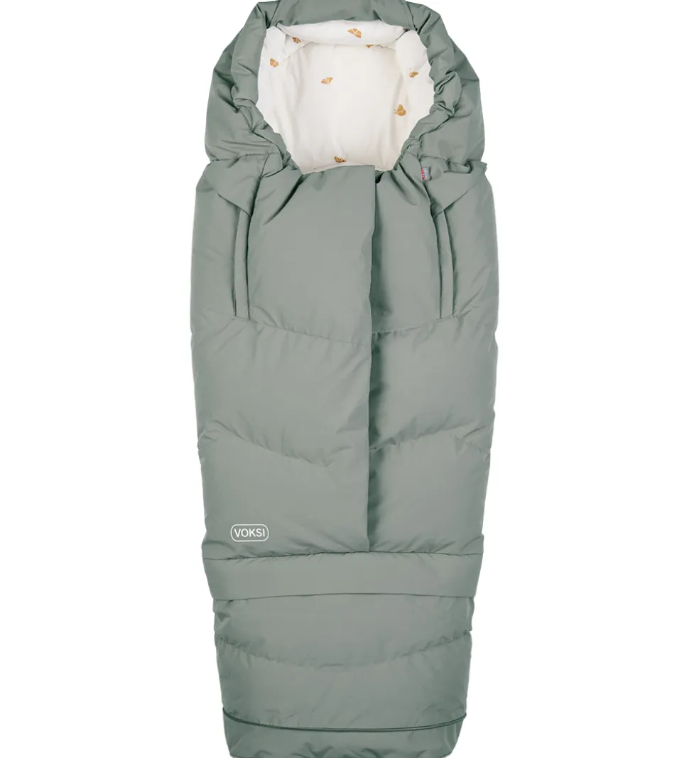 Voksiposen er foret med blødt bomuld, og den er vatteret med lune dun og fjer, mens der er uld i ryggen. Omkring bunden af køreposen er der praktiske reflekser. Der medfølger en flad, let vatteret pude, som nemt kan vaskes, hvis den bliver beskidt.