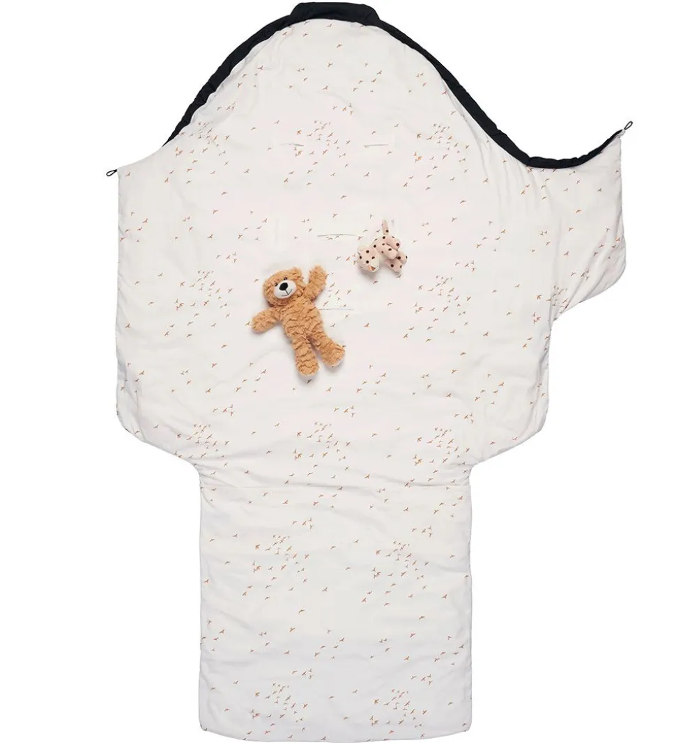 Skøn Voksi Classic kørepose i sort, med et hvidt for med beige fugle.