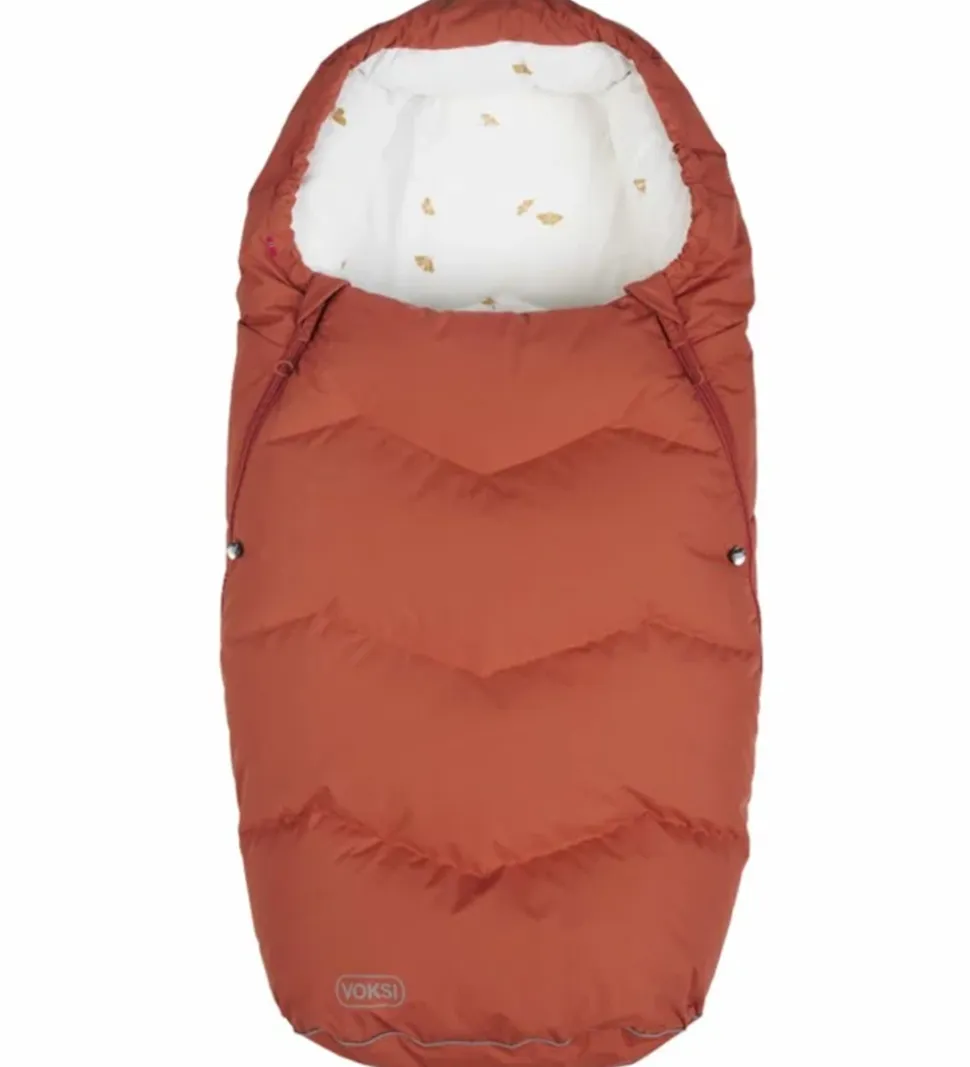 Voksiposen har et for af bomuldsjersey i hvid med et alloverprint med rødbrune sommerfugle, og i forstykket er den vatteret med dun og fjer, mens der er et lækkert uldfor i ryggen.