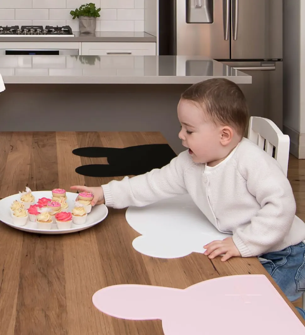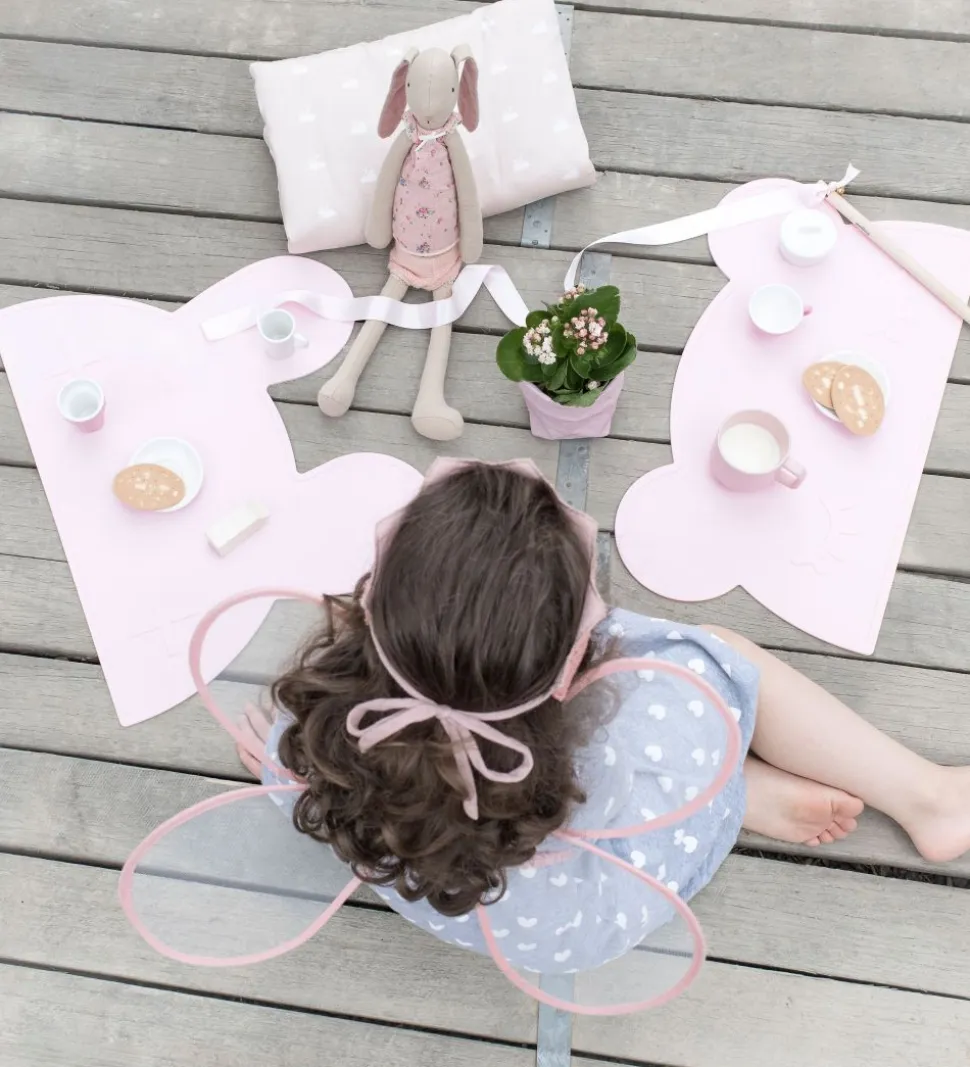 Sød We Might Be Tiny dækkeserviet formet som et kanin hoved, i pink.