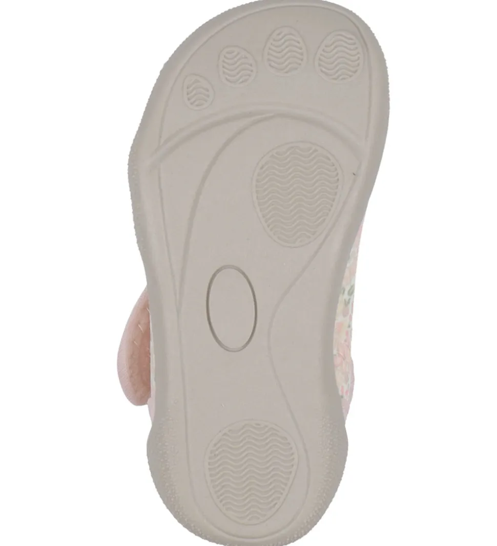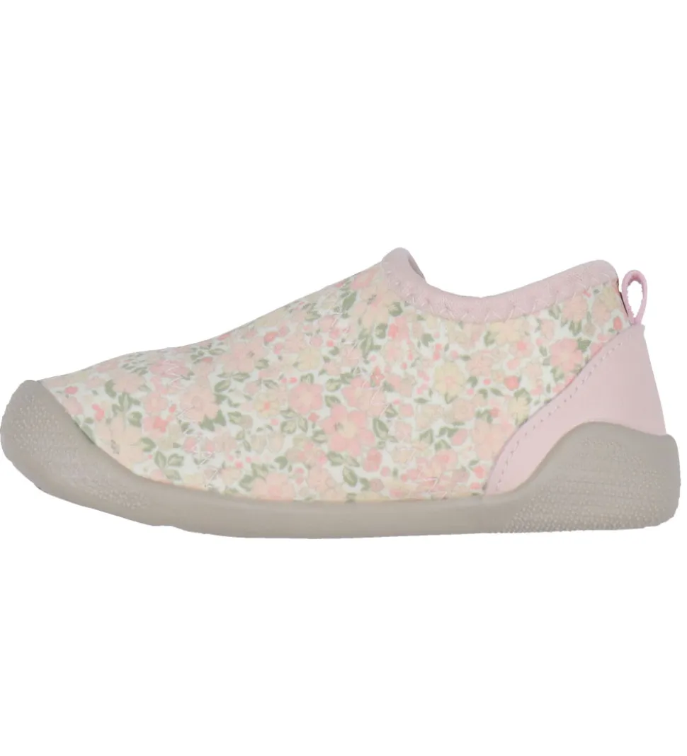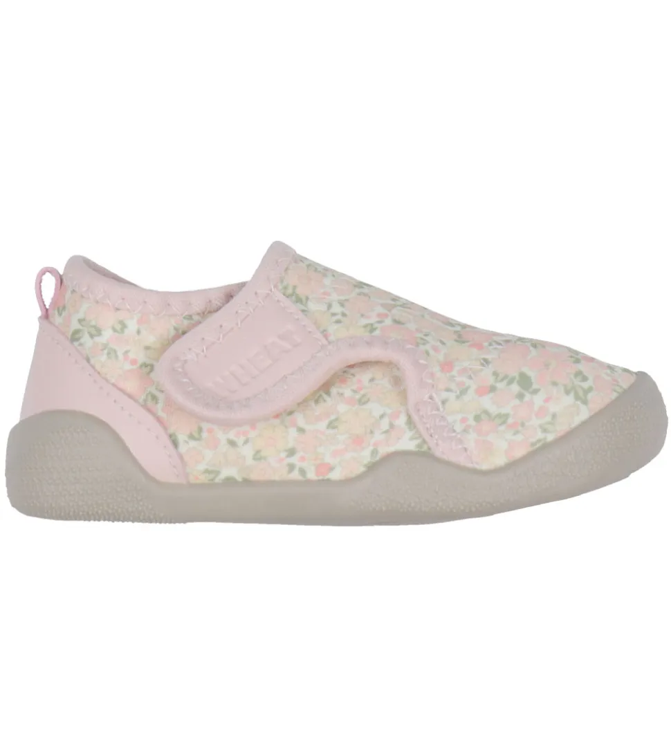 Søde Wheat badesko med fint alloverblomsterprint i forskellige rosa nuancer samt med lyserøde detaljer.