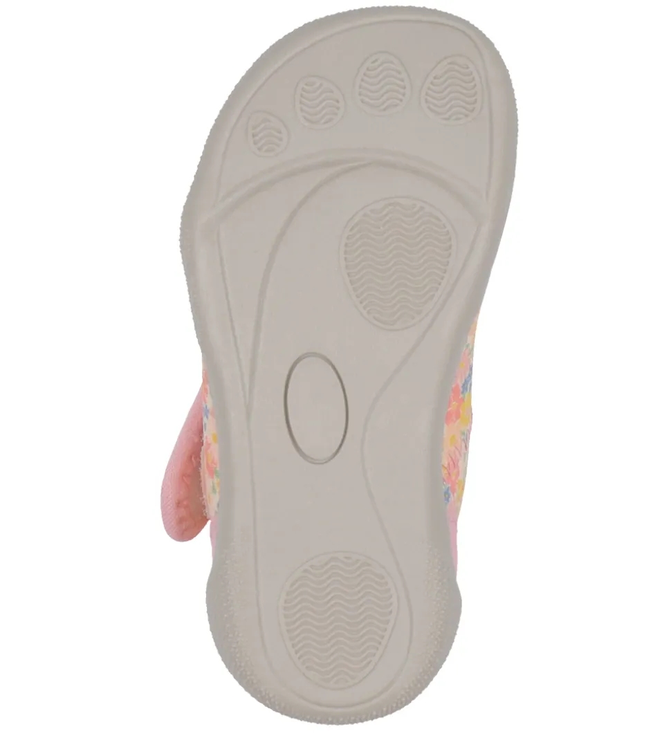 Fine Wheat badesko med et farverigt alloverblomsterprint samt med lyserøde detaljer.