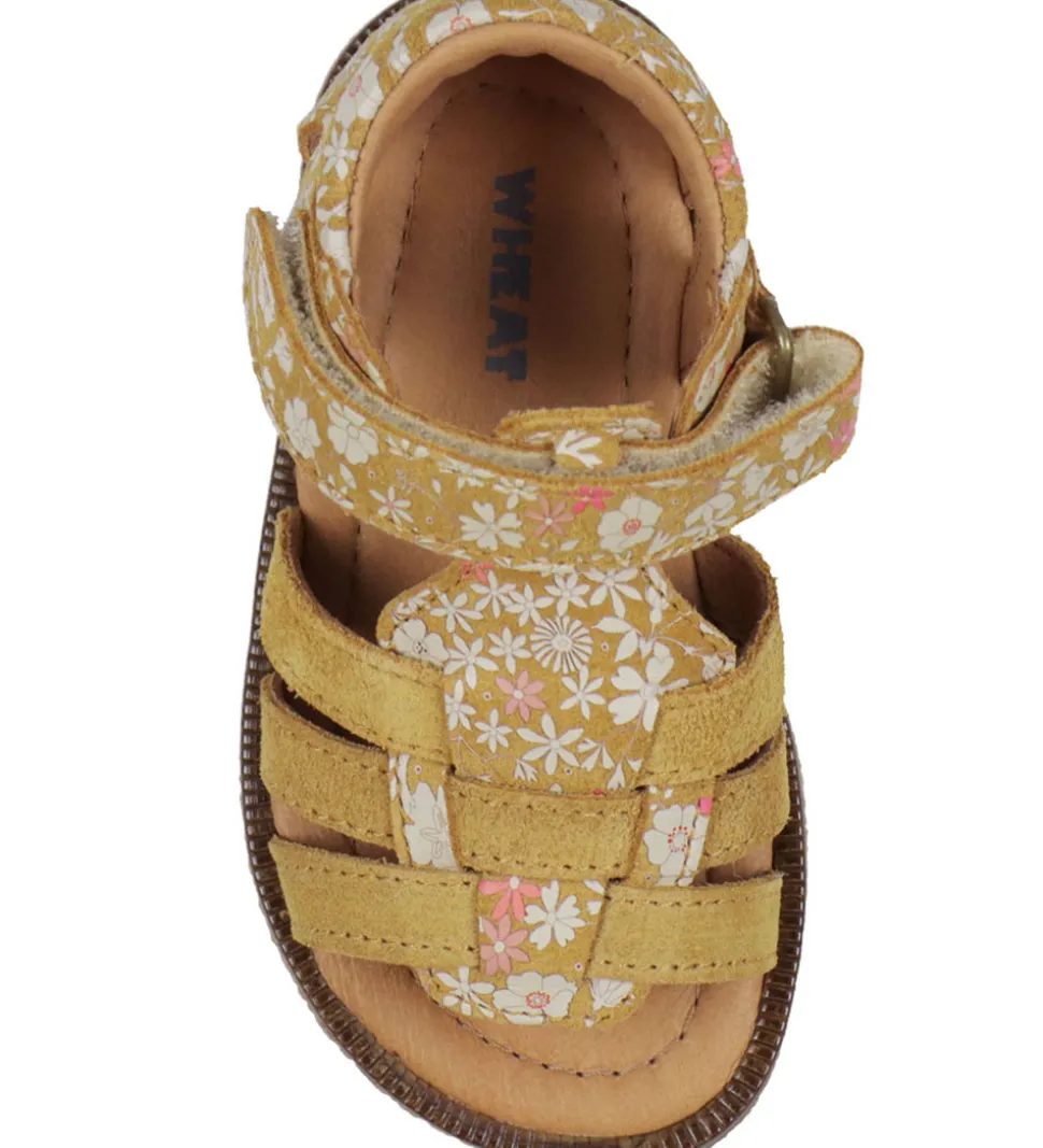 Charmerende Wheat sandaler i karrygul ruskind med print af blomster i råhvid og rosa.