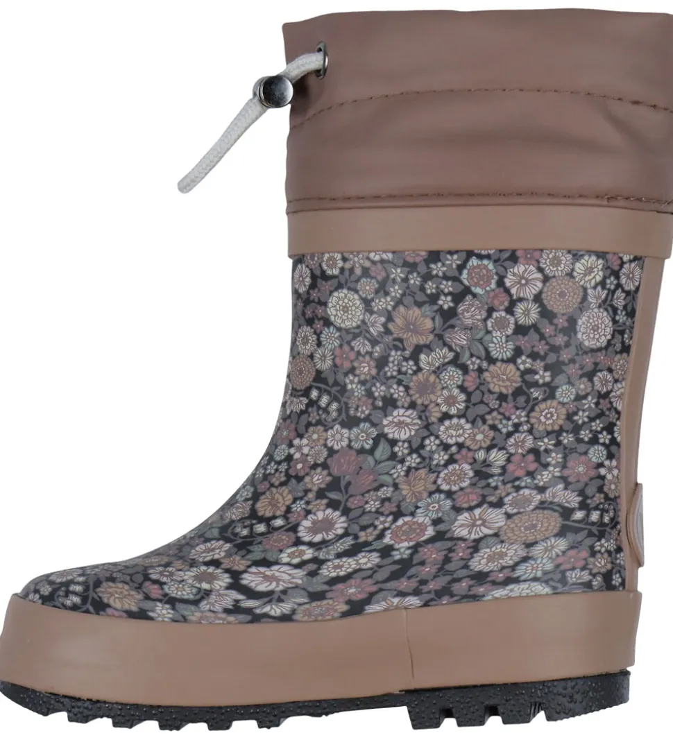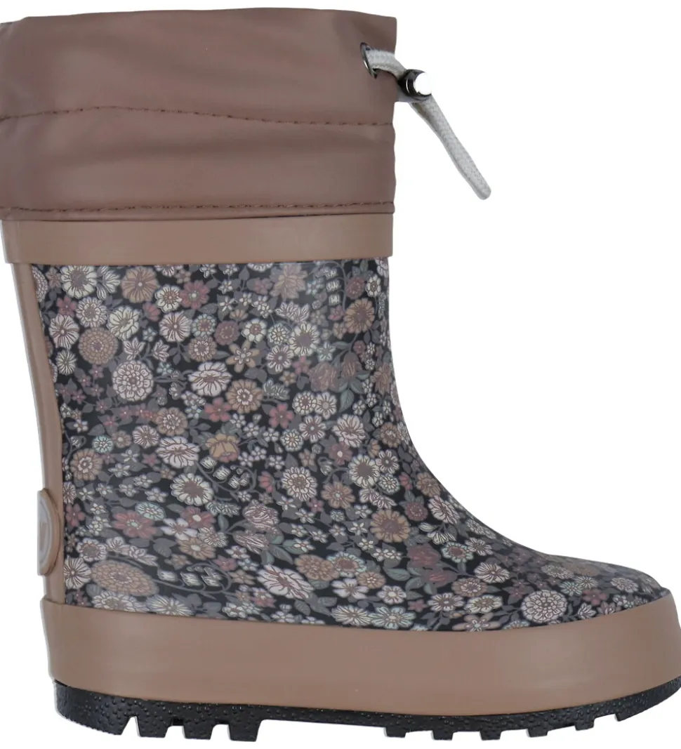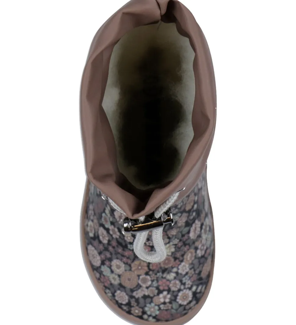 Fine Wheat termostøvler i støvet, mørk lilla med et alloverprint af blomster i blå, lilla, grønne og hvide nuancer. Termostøvlerne har et reflekslogo på hælene.