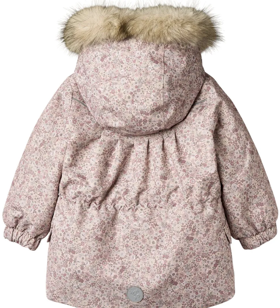 Fin Wheat vinterjakke i rosa med et alloverblomsterprint i lilla, rosa og grønne farver og med en flot kant af imiteret pels på hætten.