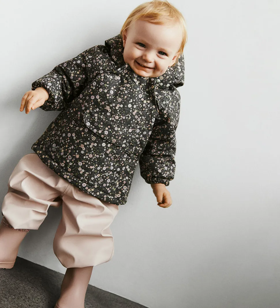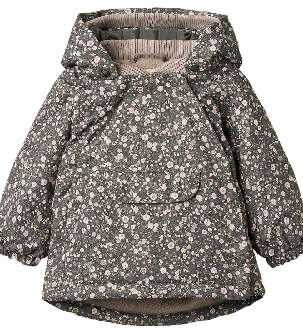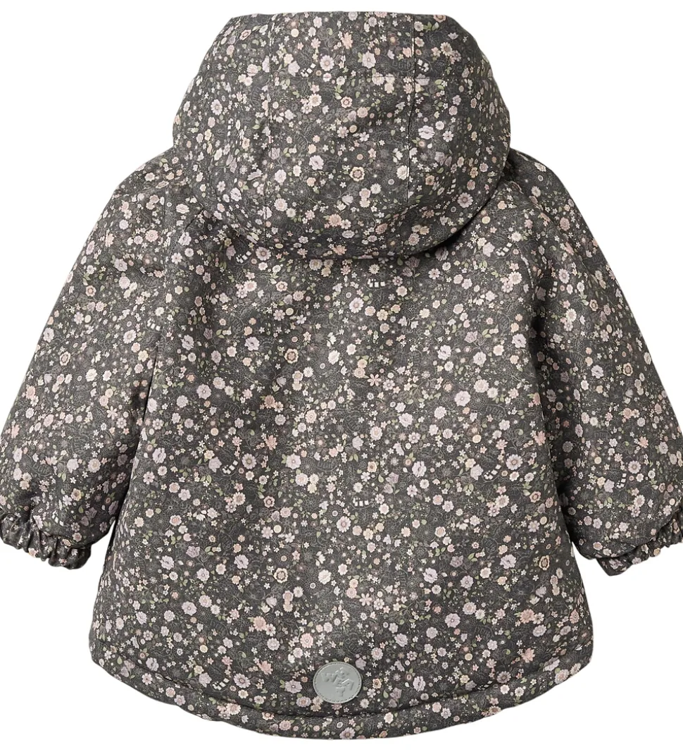 Lækker Wheat vinterjakke i mørk koksgrå med et alloverblomsterprint i støvede lilla, rosa og grønne nuancer.