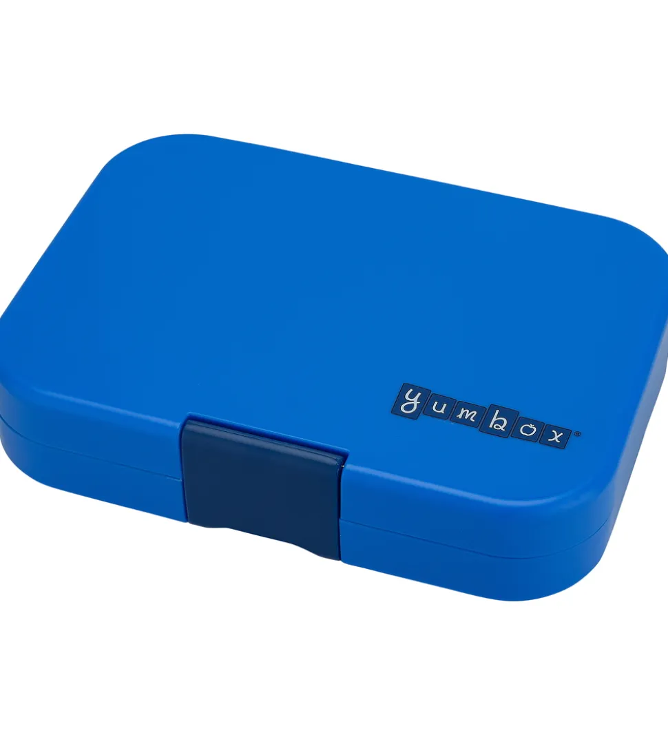 Fin Yumbox madkasse i blå nuancer med et logo i højre side. Rumdeleren har et sejt rumprint.